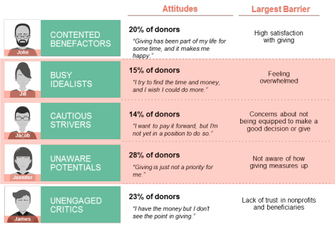 - Target the donor segments most likely to change their behavior—the report identifies them as “Busy Idealists,” “Cautious Strivers,” and “Unaware Potentials.” It includes a segmentation tool kit to help nonprofits identify these donors.